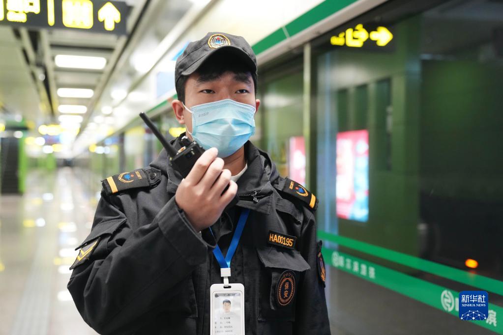 1月21日,在哈爾濱地鐵2號線(xiàn)省醫院站,站臺保安付延楠堅守崗位。