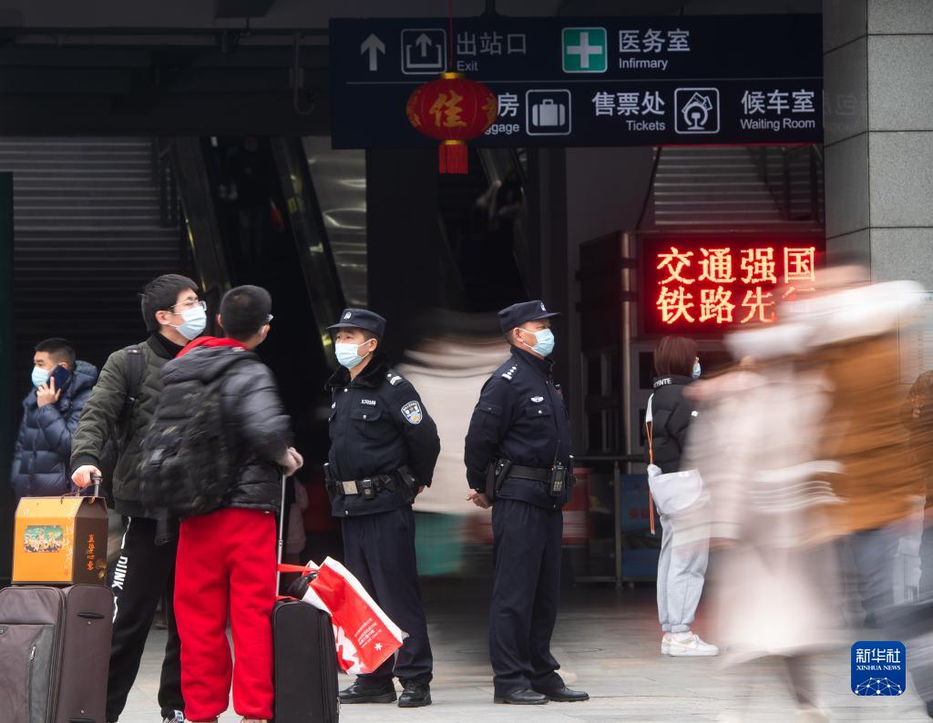 1月21日,民警王勁松(右)與同事劉小龍在湖北省宜昌東站出站口執勤。