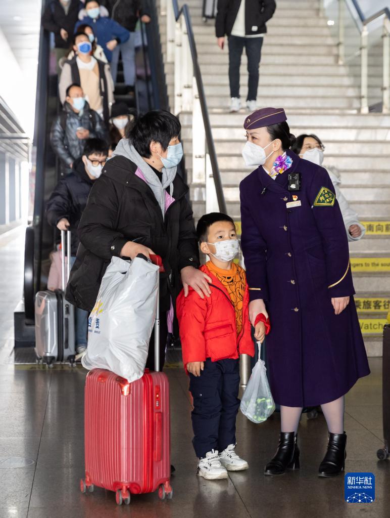 1月21日,鐵路上??瓦\段列車(chē)長(cháng)顧蓉解答一名帶小孩旅客的詢(xún)問(wèn)。