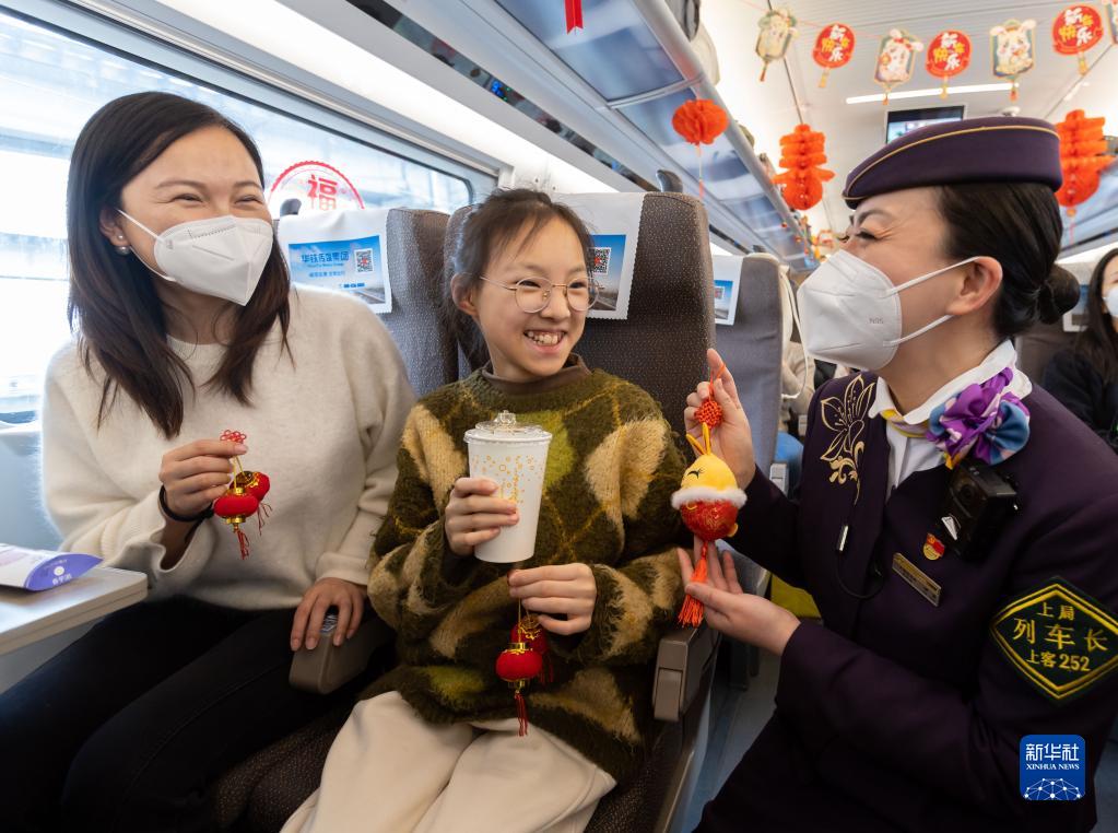 1月21日,鐵路上??瓦\段列車(chē)長(cháng)顧蓉在G1956次列車(chē)上給小朋友送新年禮物。