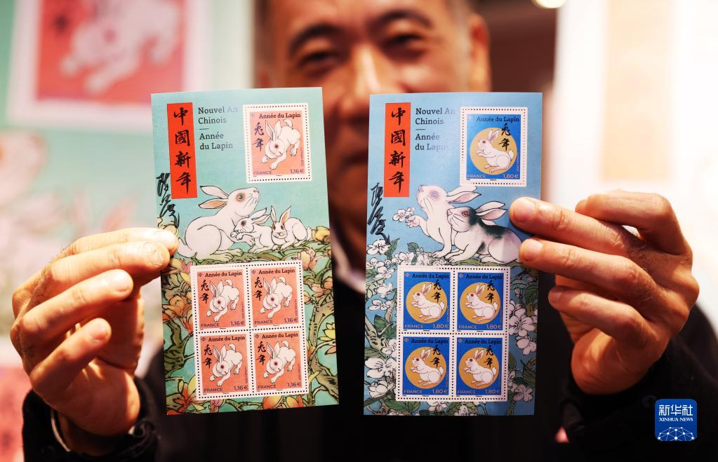 為迎接中國農歷新年,法國郵政公司14日在巴黎舉行中國兔年生肖紀念郵票發(fā)行儀式。中國兔年生肖紀念郵票共兩款,由法國華人藝術(shù)家陳江洪設計。