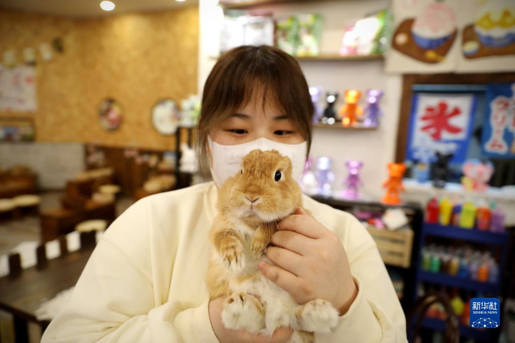 1月20日,沈陽(yáng)一家兔咖寵物體驗店的店員抱著(zhù)一只寵物兔。