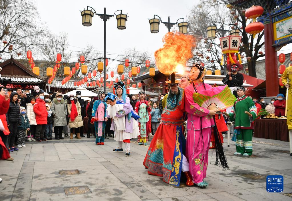 1月14日,演員在陜西省西安市新城區永興坊景區表演傳統社火。市民游客在感受傳統文化中迎接新春佳節。