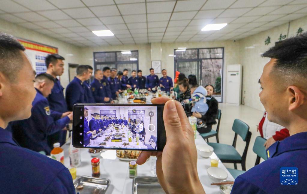 1月21日,在貴州省黔東南苗族侗族自治州岑鞏縣消防救援大隊食堂,消防員和家屬在年夜飯飯桌上合影留念。
