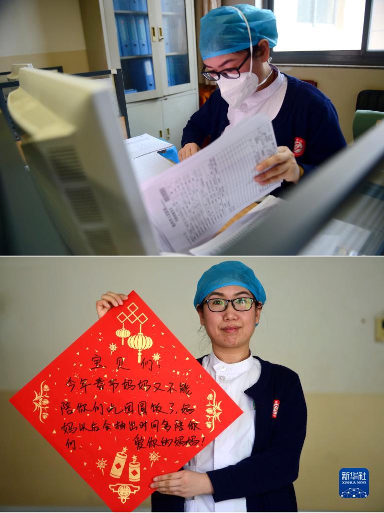 拼版照片:1月21日,滄州市人民醫院創(chuàng )傷脊柱骨科護士周麗在整理患者病歷(上圖);周麗寫(xiě)的“致歉語(yǔ)”:“寶貝們:今年春節媽媽又不能陪你們吃團圓飯了,媽媽以后會(huì )抽出時(shí)間多陪你們”(下圖)。