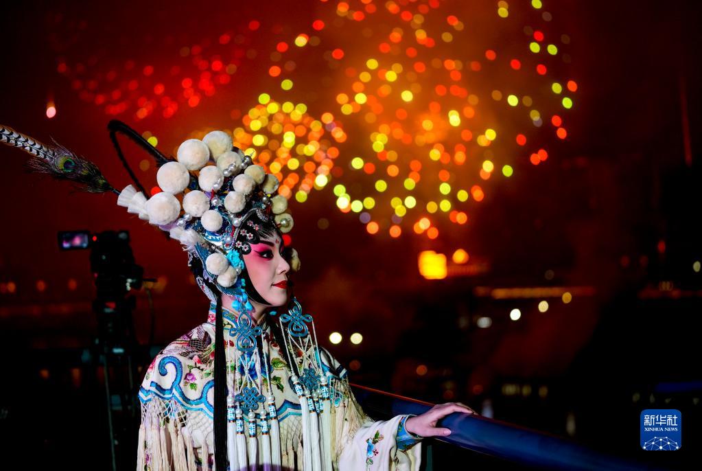 1月22日凌晨,一名川劇演員在當天演出結束后觀(guān)賞焰火表演。