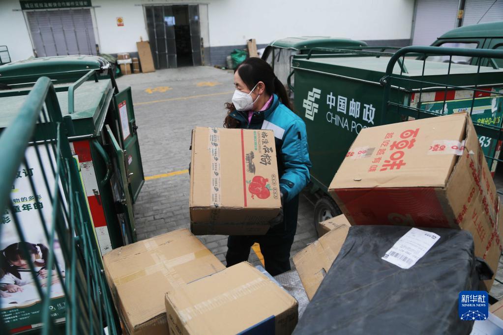 1月22日,甘肅省定西市郵政快遞的員工在裝運郵件、快件。