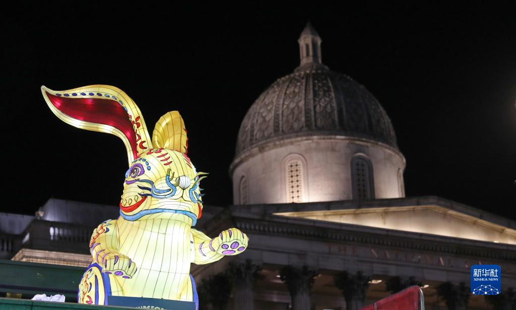 1月21日晚,兔子彩燈在英國倫敦特拉法加廣場(chǎng)點(diǎn)亮。