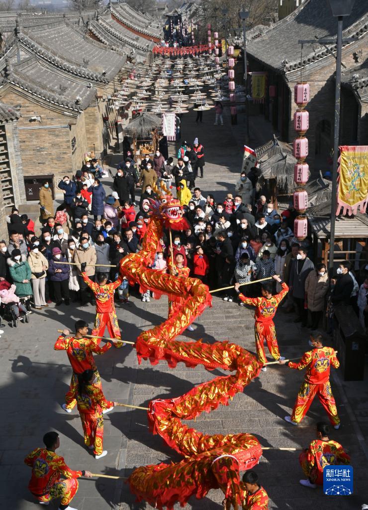 1月22日,游客在山西省陽(yáng)曲縣青龍古鎮內觀(guān)看舞龍表演。