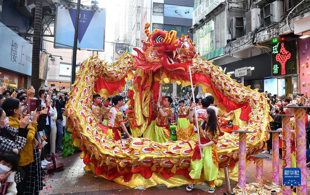 1月22日,香港灣仔街頭舉行舞龍表演,慶賀新春。