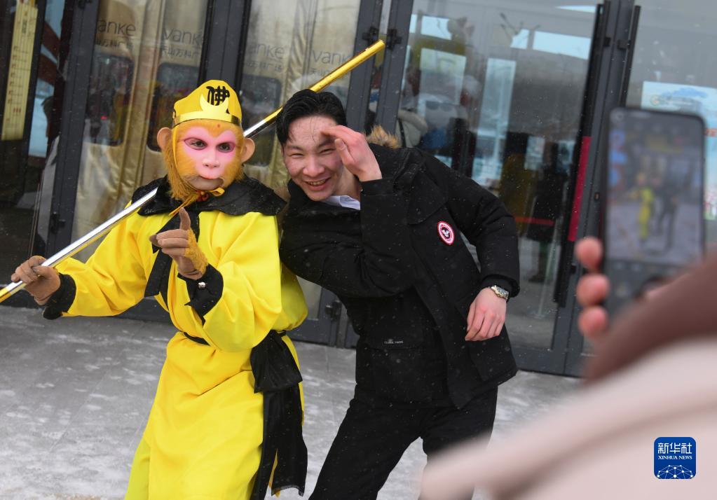 1月22日,在位于新疆烏魯木齊的天山萬(wàn)科廣場(chǎng)前,市民與民間社火團隊演員合影。