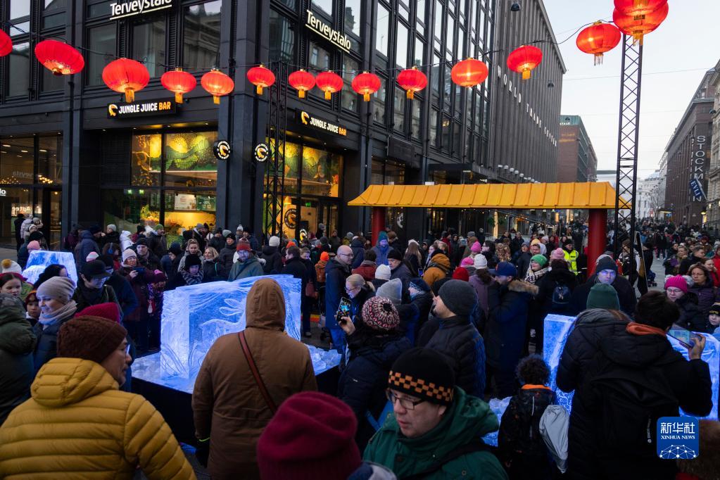 赫爾辛基的中國新年慶?;顒?dòng)21日在市中心舉行。串串火紅的燈籠將街道裝飾一新,以兔子為主題元素的冰雕展和舞獅等傳統民俗表演吸引了大批民眾。