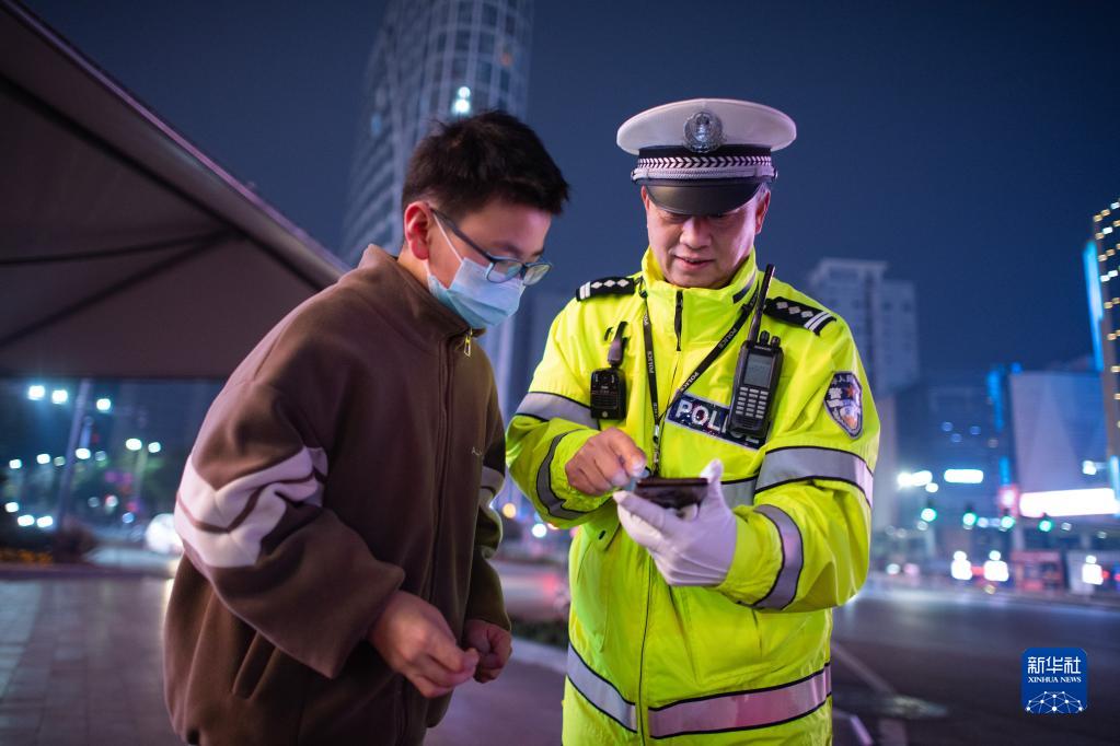 1月21日除夕夜,在宜昌市城東大道,梅大順(右)幫助走散的學(xué)生聯(lián)系家人。