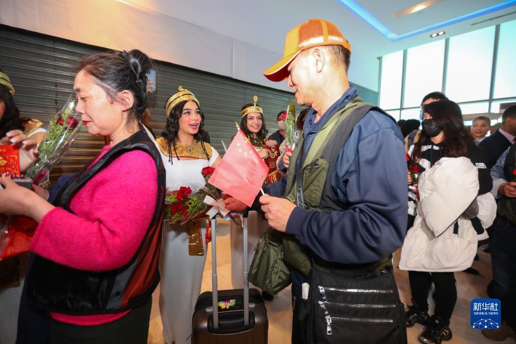 1月20日,中國游客到達埃及開(kāi)羅國際機場(chǎng)后受到熱情歡迎。