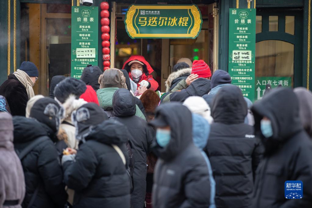 1月22日,游客在哈爾濱市道里區中央大街排隊購買(mǎi)冰棍。