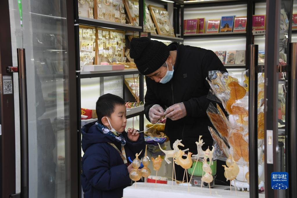 1月22日,在北京煙袋斜街的一家店鋪,小朋友體驗吹糖人。
