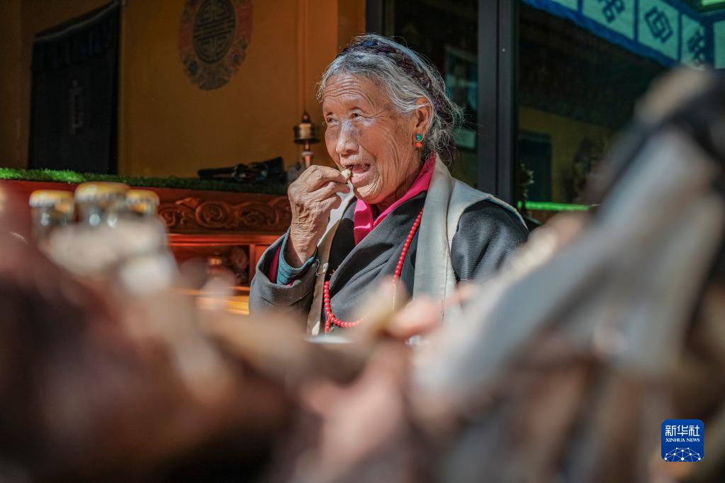 次旦老人在吃糌粑(1月22日攝)。