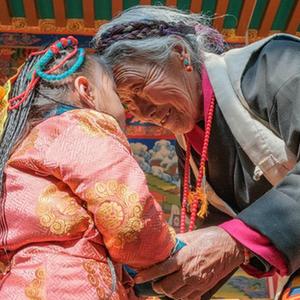 在位于西藏日喀則拉孜縣扎西宗鄉雜村的家中,次旦老人一臉幸福的微笑,家中小輩正輪流上前和她行碰頭禮。