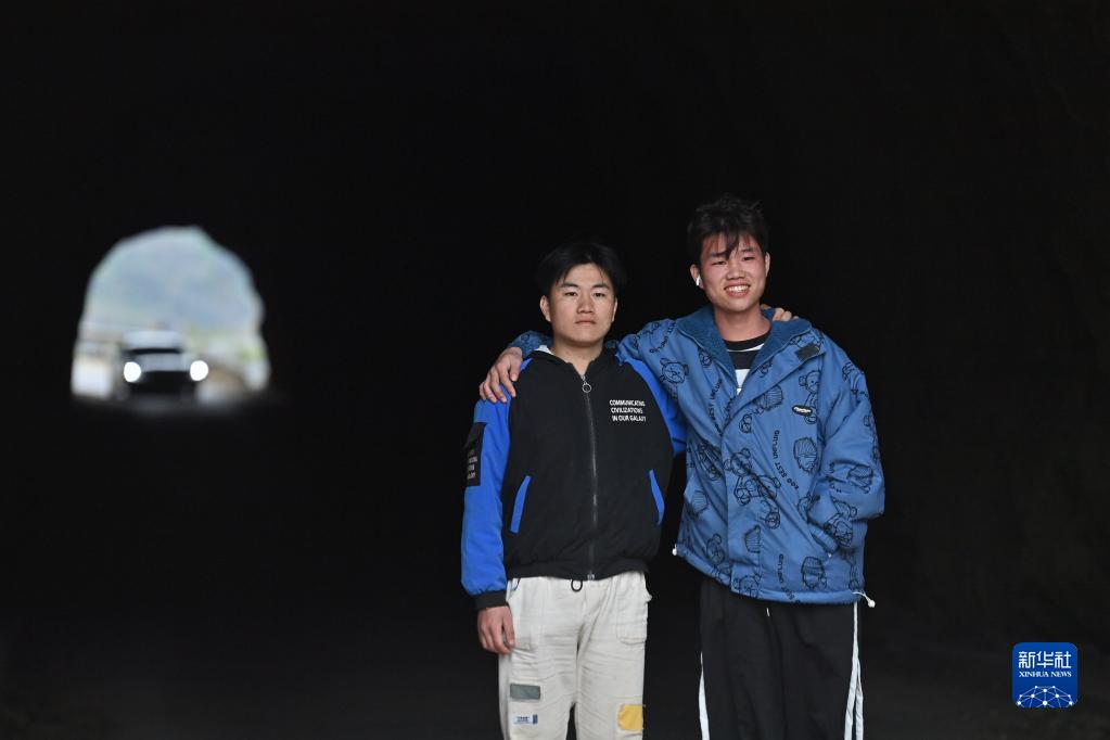 蒙宣任(左)和蒙宣汰在懸梯下方的隧道合影(2023年1月20日攝)。2014年,隧道打通、公路修通后,“天梯上學(xué)路”成為歷史。