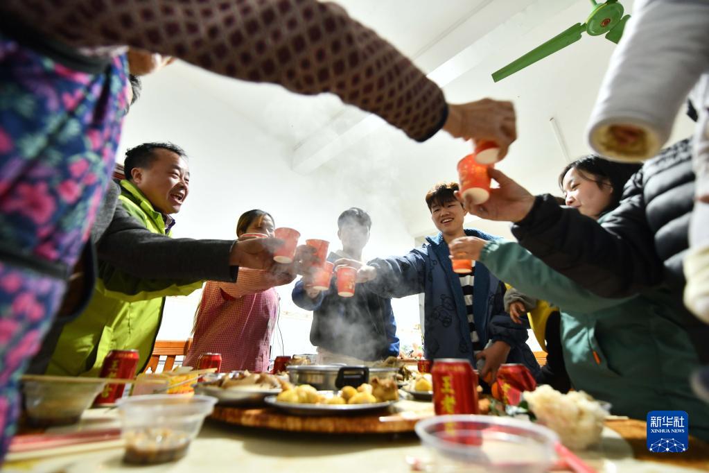 蒙宣任(中左)、蒙宣汰(中右)兄弟在家中吃團圓飯(2023年1月20日攝)。