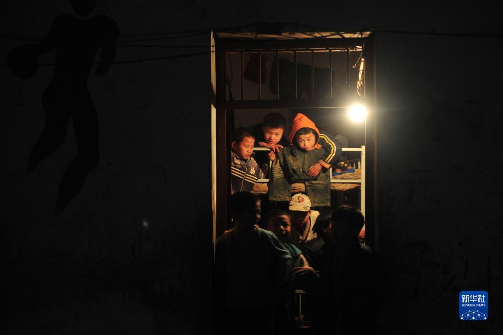 在弄勇小學(xué)讀二年級的蒙宣汰(上右)和同學(xué)在宿舍里準備睡覺(jué)(2012年12月26日攝)。