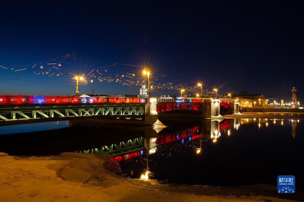 1月21日晚,俄羅斯圣彼得堡市中心涅瓦河上的地標性建筑冬宮橋亮起“中國紅”,迎接兔年春節的到來(lái)。