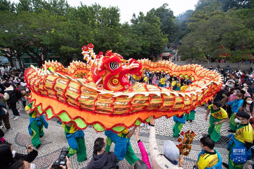 1月23日,演員在澳門(mén)媽閣廟前表演舞龍。