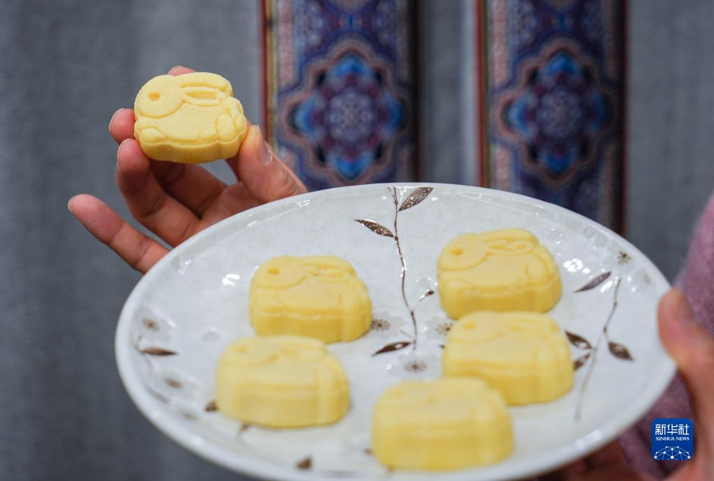 一名南京市民展示“玉兔”形綠豆糕(1月23日攝)。