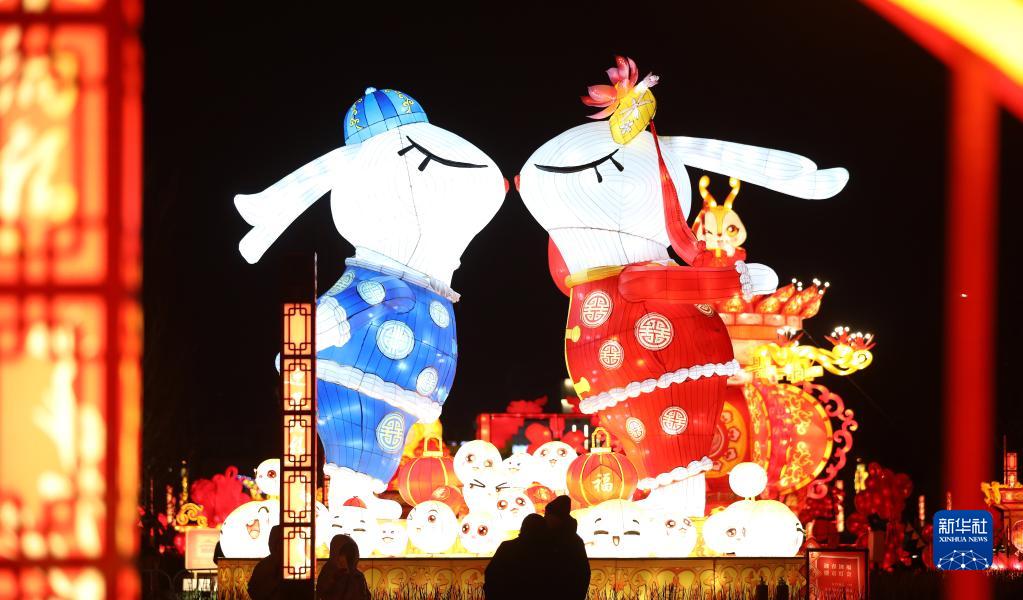 沈陽(yáng)故宮門(mén)前廣場(chǎng)的兔年花燈(1月15日攝)。