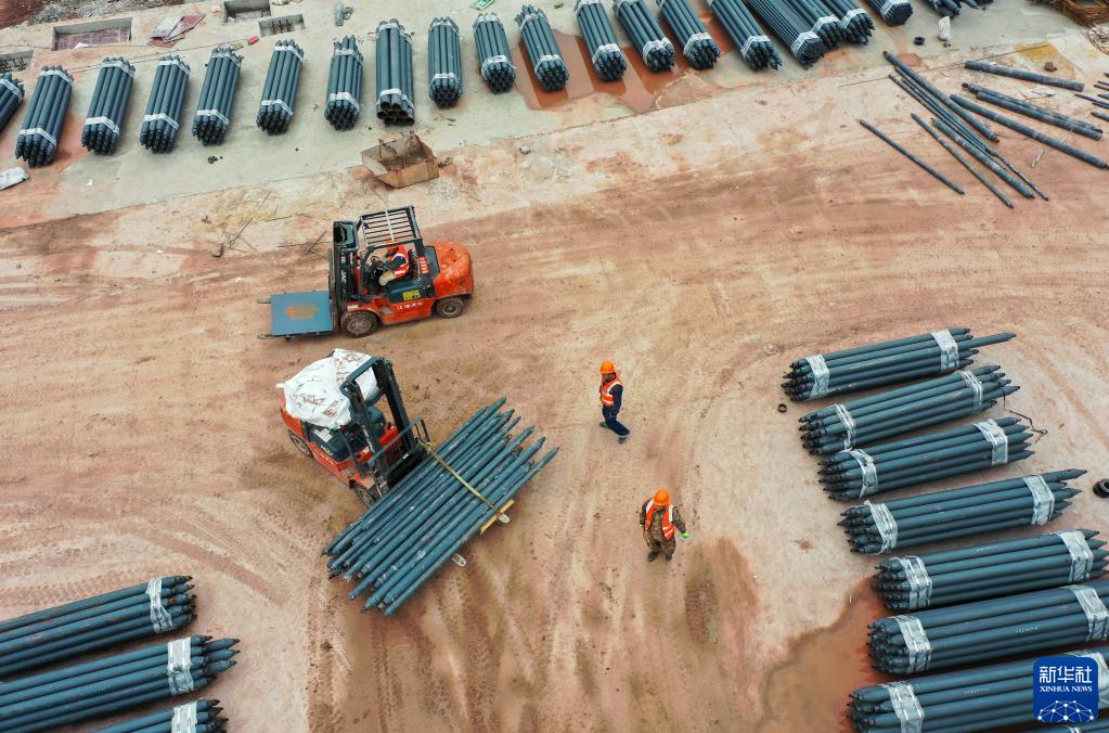 1月23日,在重慶兩江新區新能源汽車(chē)產(chǎn)業(yè)園基礎設施配套項目現場(chǎng),工人在運輸鋼結構材料(無(wú)人機照片)。