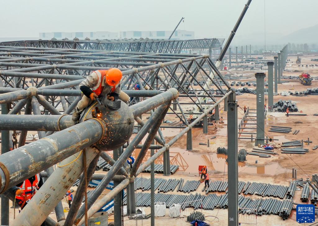 1月23日,在重慶兩江新區新能源汽車(chē)產(chǎn)業(yè)園基礎設施配套項目現場(chǎng),工人在進(jìn)行鋼結構施工作業(yè)(無(wú)人機照片)。