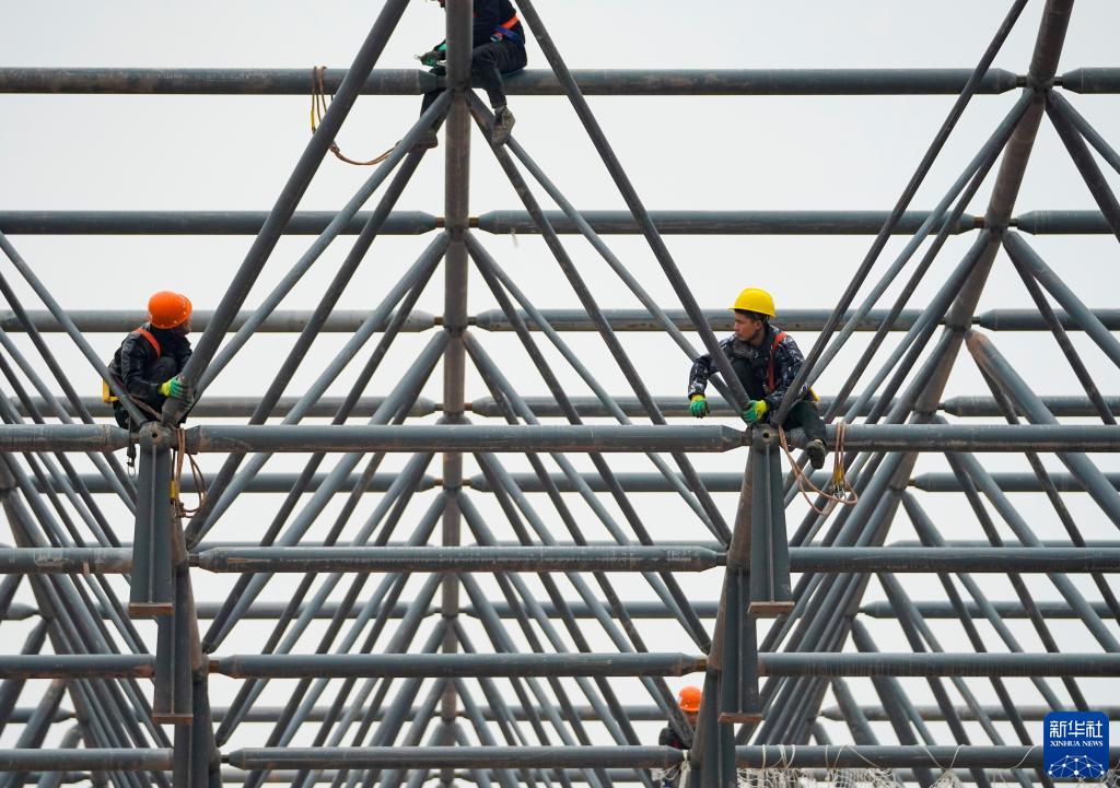 1月23日,在重慶兩江新區新能源汽車(chē)產(chǎn)業(yè)園基礎設施配套項目現場(chǎng),工人在吊車(chē)的協(xié)助下進(jìn)行鋼結構網(wǎng)架拼裝作業(yè)。