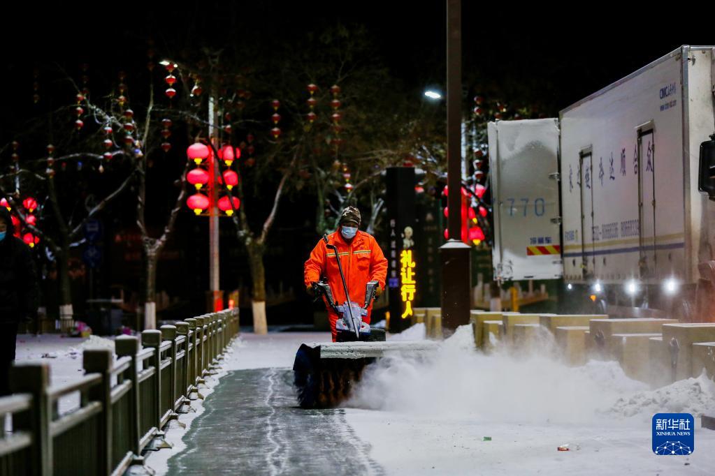 1月23日,在甘肅省酒泉市東方廣場(chǎng),環(huán)衛工人用除雪車(chē)清理路面上的積雪。