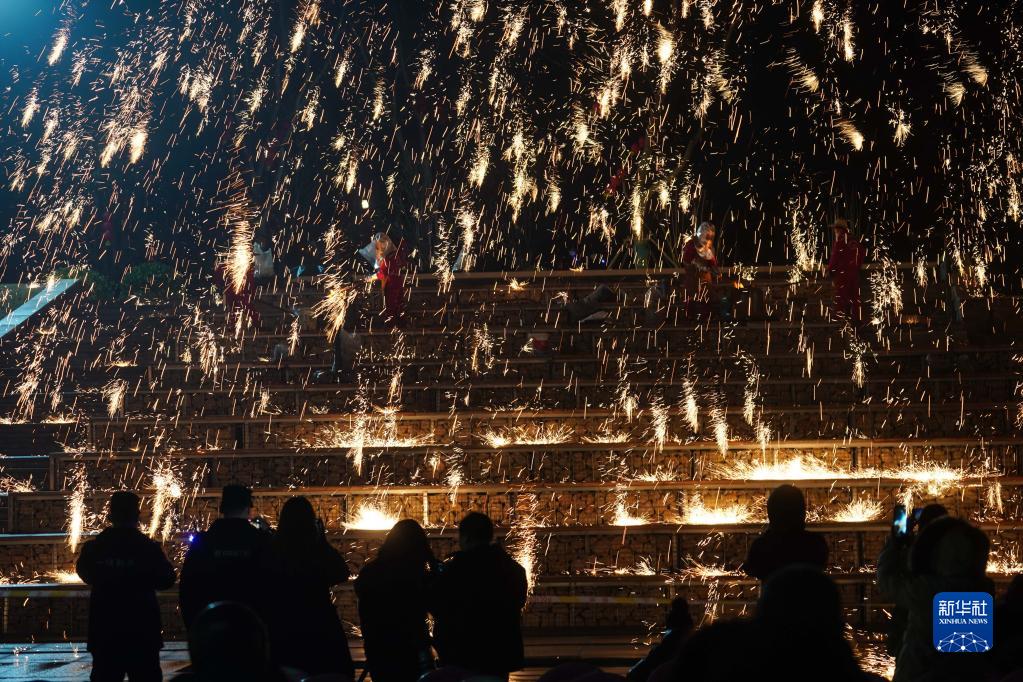 1月23日,觀(guān)眾在盱眙第一山歷史文化街區觀(guān)看打鐵花表演。