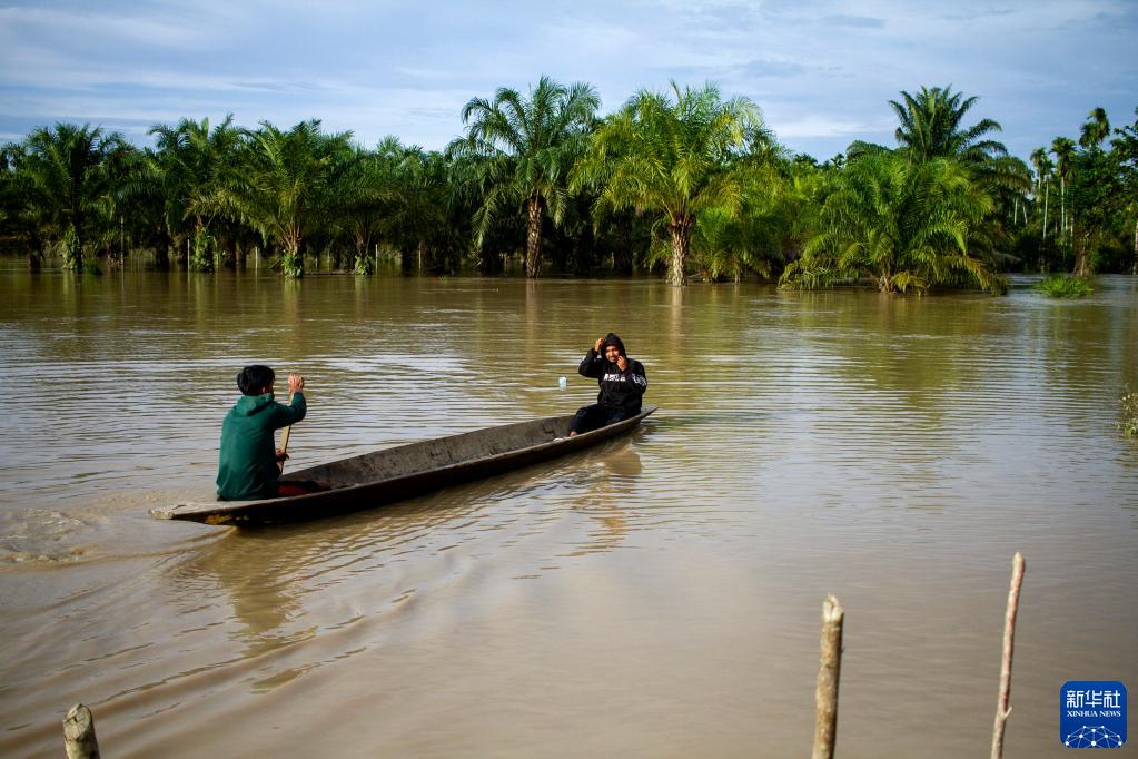 1月23日,在印度尼西亞亞齊特區北亞齊地區,人們在洪水中乘獨木舟。