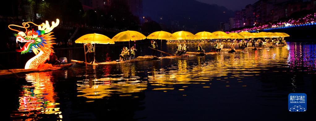 1月23日晚,人們在湖北省宣恩縣城貢水河上體驗“貢水游龍”。