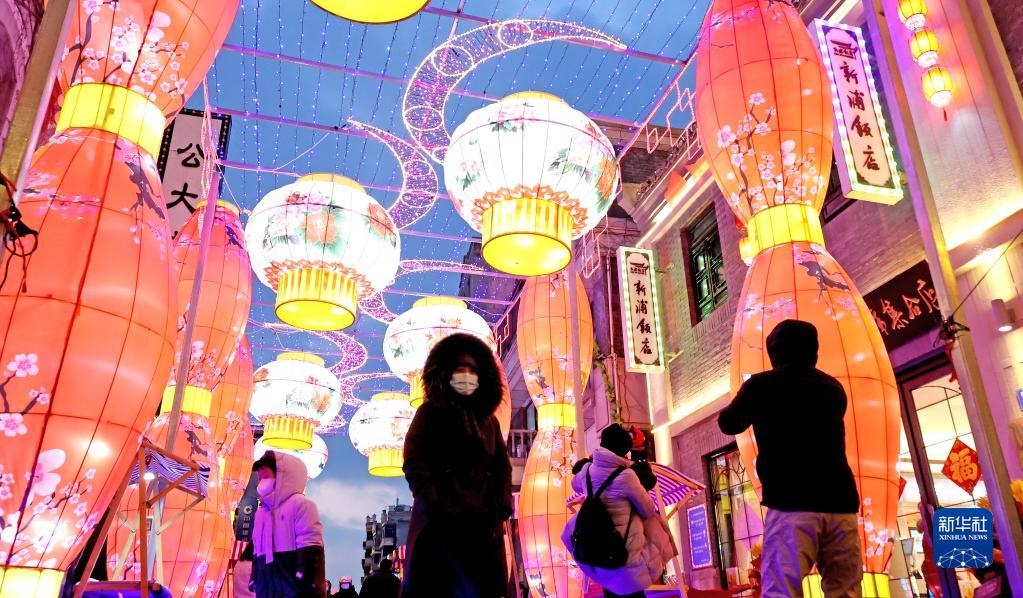 1月23日晚,在江蘇省連云港市海州區民主路老街,逛夜市的人們從各式彩燈下經(jīng)過(guò)。