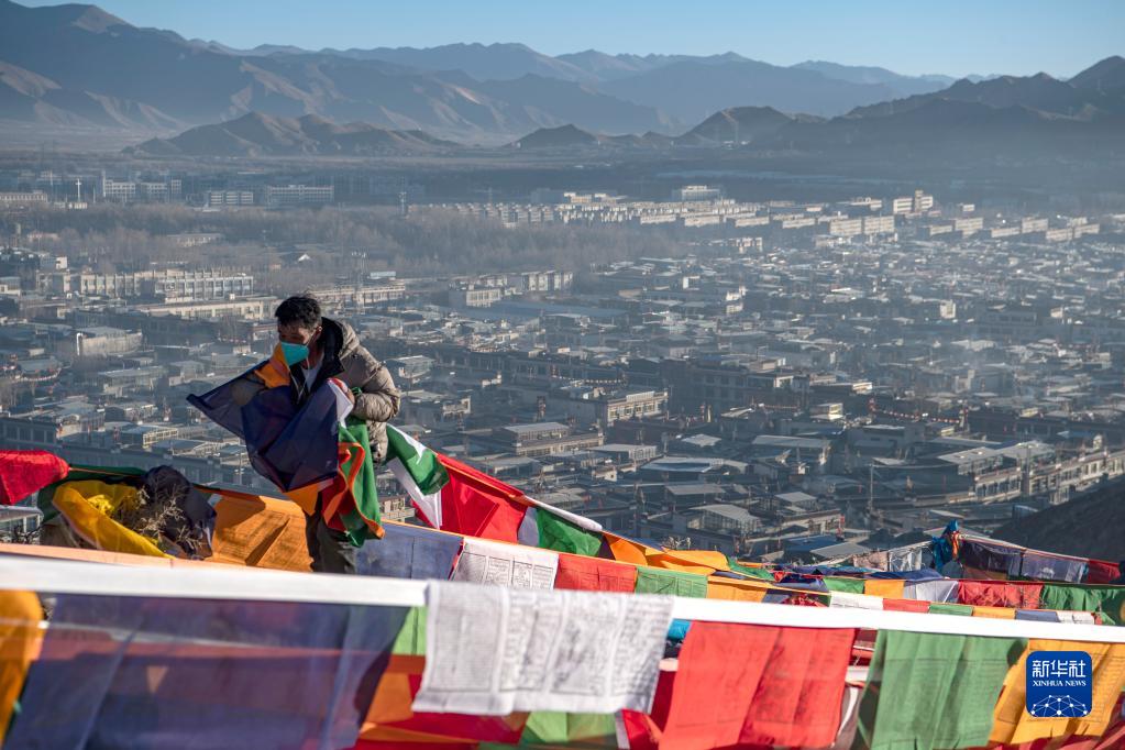 1月24日,日喀則市桑珠孜區的藏族群眾在山上懸掛五彩經(jīng)幡。