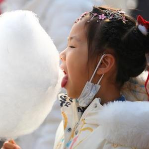 1月23日,在云南省昆明市南屏街,一個(gè)小孩子在品嘗特色小吃。