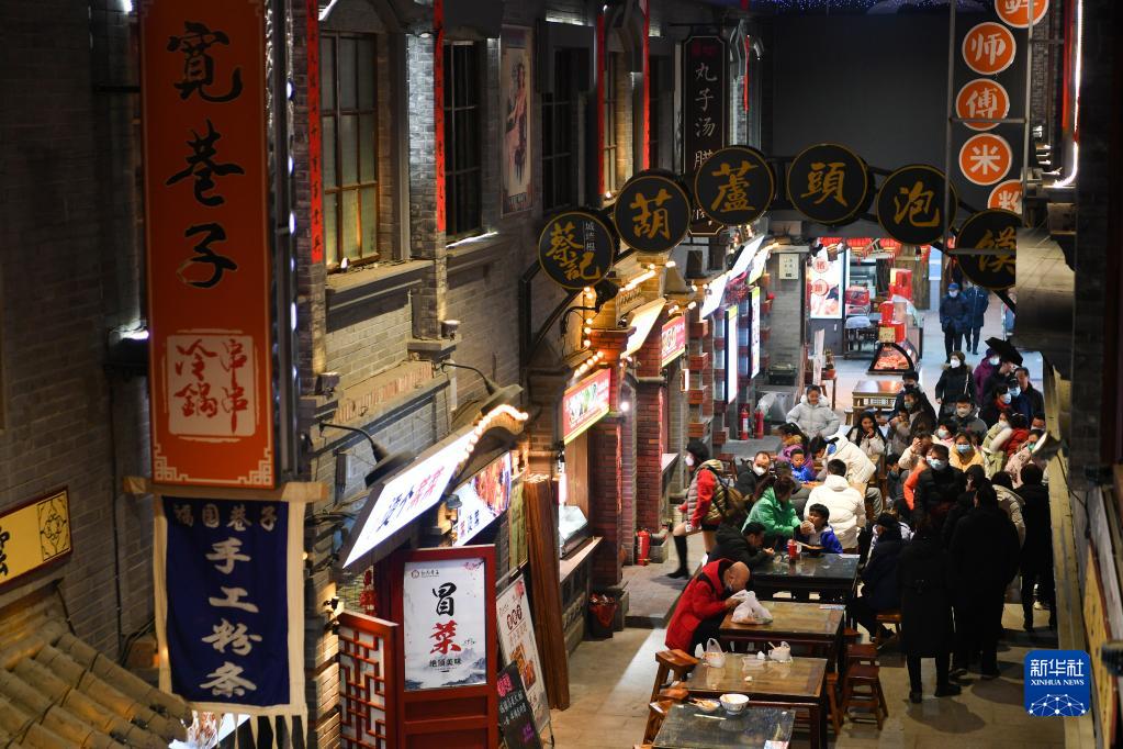 1月24日,市民在位于陜西省咸陽(yáng)市的福園巷子街區游覽,品味特色美食。
