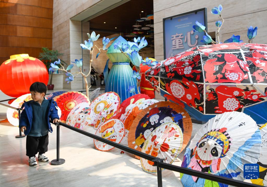 1月24日,在四川成都的金沙遺址博物館,小朋友在“童心點(diǎn)亮金沙”校園非遺成果展前留影。