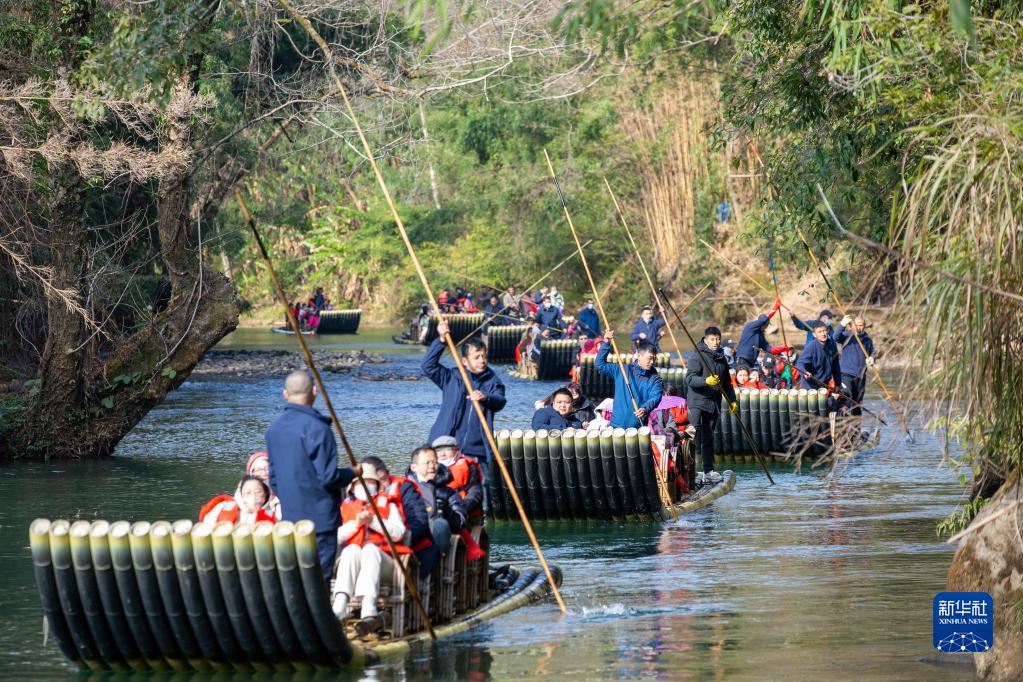1月24日,游客在福建武夷山景區乘竹筏游覽九曲溪。