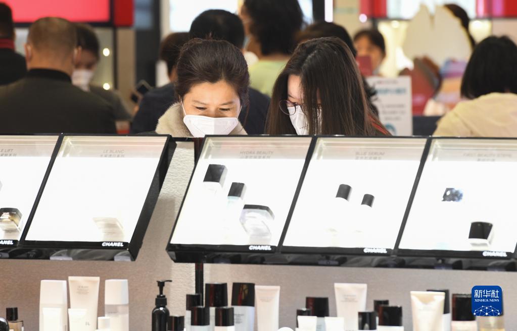 1月25日,游客在中免集團??谌赵聫V場(chǎng)免稅店選購免稅商品。