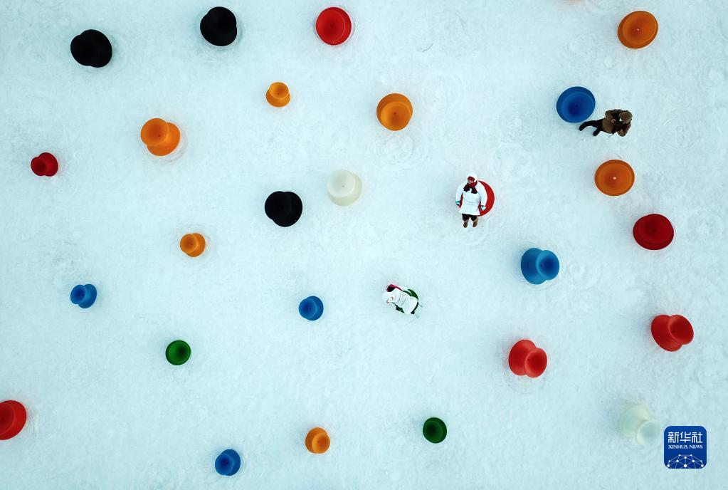 1月24日,游客在哈爾濱太陽(yáng)島雪博會(huì )園區內體驗冰雪娛樂(lè )項目(無(wú)人機照片)。
