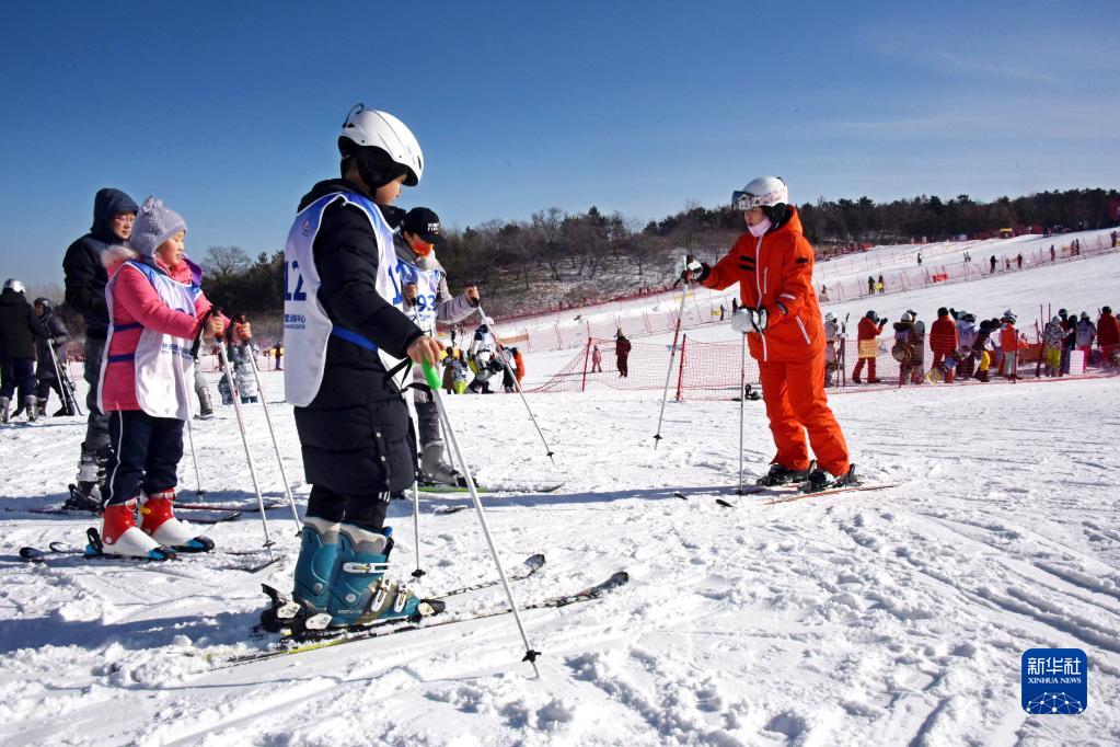 1月25日,青島西海岸新區藏馬山滑雪場(chǎng)滑雪教練員在指導游客。
