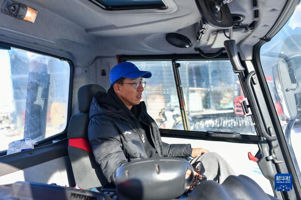 壓雪機駕駛員李壽乾在新疆絲綢之路國際度假區操作機器(1月25日攝),他的父親是雪場(chǎng)的電工。