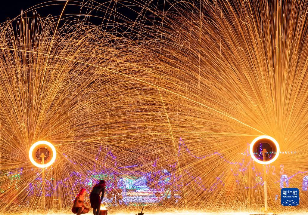1月25日晚,民間藝人在四川省華鎣市祿市鎮六水溝村“百萬(wàn)玫瑰”生態(tài)園表演“打鐵花”。