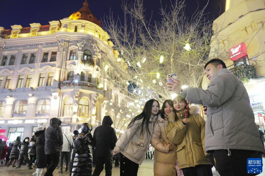 1月25日,游客在哈爾濱中央大街留影。