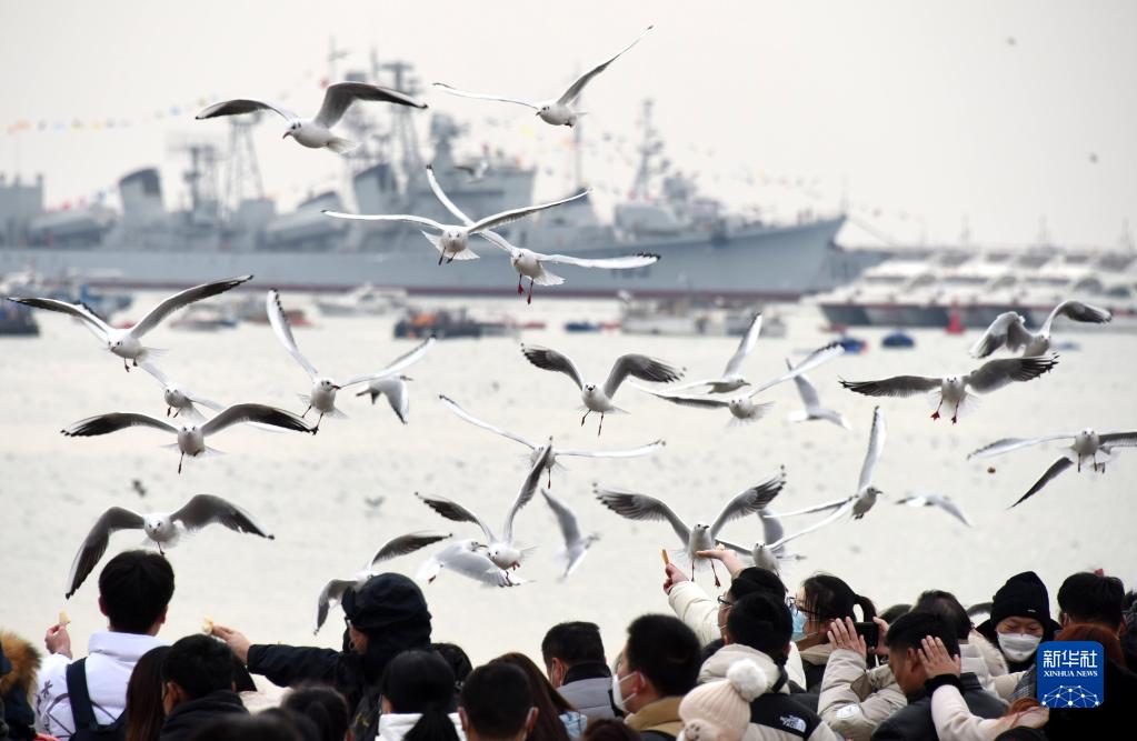 1月26日,游客在青島海軍博物館附近海邊觀(guān)賞海鷗。