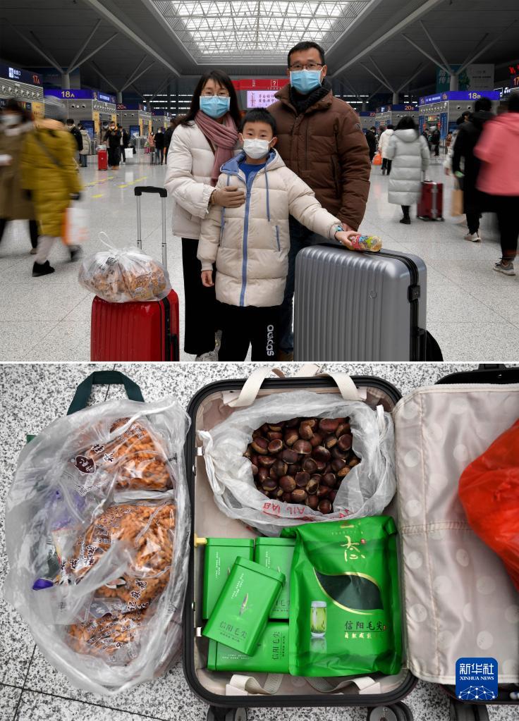 拼版照片:河南省信陽(yáng)市浉河區董家河鄉高嶺村人劉紅善(右)和愛(ài)人傅雪梅、兒子劉宇辰在鄭州東站候車(chē)大廳內候車(chē),準備去往廣州(1月26日攝)。劉紅善在廣州已經(jīng)工作了6年,近3年都沒(méi)能回老家過(guò)春節,今年專(zhuān)門(mén)回家陪老父親過(guò)節。下圖為劉紅善行囊里裝的家人給準備的信陽(yáng)特產(chǎn)茶葉和板栗等(1月26日攝)。